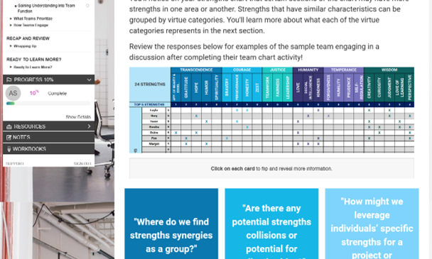 This course offers four strengths-driven activities that help teams build essential positive strengths-based practices, understand how strengths shape their internal culture, and develop methods to improve each team member’s overall work experience.