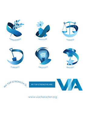 VIA Classification of Character Strengths Stickers are a fun, easy way to keep strengths top-of-mind as you work with clients and students to build their best life. Research shows people who use their character strengths a lot are 18 times more likely to be flourishing than those who do not. Our character strengths stickers and magnets will help you and your clients spot strengths in themselves and others. Use them to decorate laptops and water bottles, show off your strengths and even teach kids about their strengths! Stickers come kiss cut with 1/8 inch white border and come both individually and as a bundle.